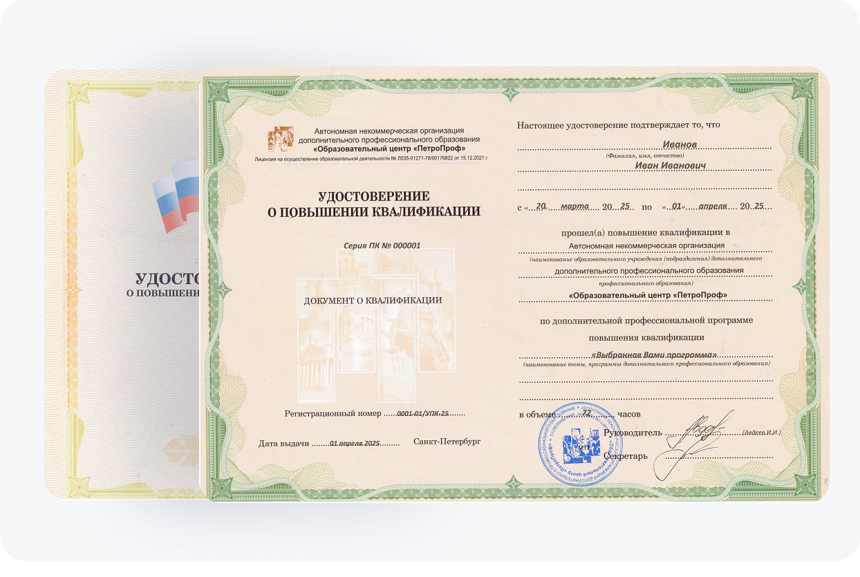 Такой документ об образовании подтверждает обновление знаний и совершенствование компетенций специалиста. Он выдается выпускникам учебного центра после подтверждения приобретенных навыков и успешной сдачи аттестации. Именно в нем указано повышение квалификации, что станет важным преимуществом претендента на должность при трудоустройстве в интересующую организацию. Удостоверение находится в твердой обложке (корочки) и удобно для ношения с собой на объект.